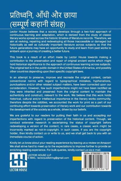 Pratidhwani, Aandhi Aur Chaaya (Sampoorna Kahani Sangraha): Pratidhwani (Kahani Sangraha), Aandhi (Kahani Sangraha), Chaaya (Kahani Sangraha) This book is a result of an effort made by us towards making a contribution to the preservation and repair of original classic literature. In an attempt to preserve, improve and recreate the original content, we have worked towards: 1. Type-setting & Reformatting: The complete work has been re-designed via professional layout, formatting and type-setting tools to re-create the same edition with rich typography, graphics, high quality images, and table elements, giving our readers the feel of holding a 'fresh and newly' reprinted and/or revised edition, as opposed to other scanned & printed (Optical Character Recognition - OCR) reproductions. 2. Correction of imperfections: As the work was re-created from the scratch, therefore, it was vetted to rectify certain conventional norms with regard to typographical mistakes, hyphenations, punctuations, blurred images, missing content/pages, and/or other related subject matters, upon our consideration. Every attempt was made to rectify the imperfections related to omitted constructs in the original edition via other references. However, a few of such imperfections which could not be rectified due to intentional\unintentional omission of content in the original edition, were inherited and preserved from the original work to maintain the authenticity and construct, relevant to the work. We believe that this work holds historical, cultural and/or intellectual importance in the literary works community, therefore despite the oddities, we accounted the work for print as a part of our continuing effort towards preservation of literary work and our contribution towards the development of the society as a whole, driven by our beliefs. We are grateful to our readers for putting their faith in us and accepting our imperfections with regard to preservation of the historical content. HAPPY READING!
