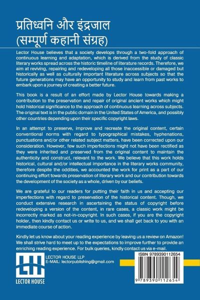 Pratidhwani Aur Indrajaal (Sampoorna Kahani Sangraha): Pratidhwani (Kahani Sangraha), Indrajaal (Kahani Sangraha) This book is a result of an effort made by us towards making a contribution to the preservation and repair of original classic literature. In an attempt to preserve, improve and recreate the original content, we have worked towards: 1. Type-setting & Reformatting: The complete work has been re-designed via professional layout, formatting and type-setting tools to re-create the same edition with rich typography, graphics, high quality images, and table elements, giving our readers the feel of holding a 'fresh and newly' reprinted and/or revised edition, as opposed to other scanned & printed (Optical Character Recognition - OCR) reproductions. 2. Correction of imperfections: As the work was re-created from the scratch, therefore, it was vetted to rectify certain conventional norms with regard to typographical mistakes, hyphenations, punctuations, blurred images, missing content/pages, and/or other related subject matters, upon our consideration. Every attempt was made to rectify the imperfections related to omitted constructs in the original edition via other references. However, a few of such imperfections which could not be rectified due to intentional\unintentional omission of content in the original edition, were inherited and preserved from the original work to maintain the authenticity and construct, relevant to the work. We believe that this work holds historical, cultural and/or intellectual importance in the literary works community, therefore despite the oddities, we accounted the work for print as a part of our continuing effort towards preservation of literary work and our contribution towards the development of the society as a whole, driven by our beliefs. We are grateful to our readers for putting their faith in us and accepting our imperfections with regard to preservation of the historical content. HAPPY READING!