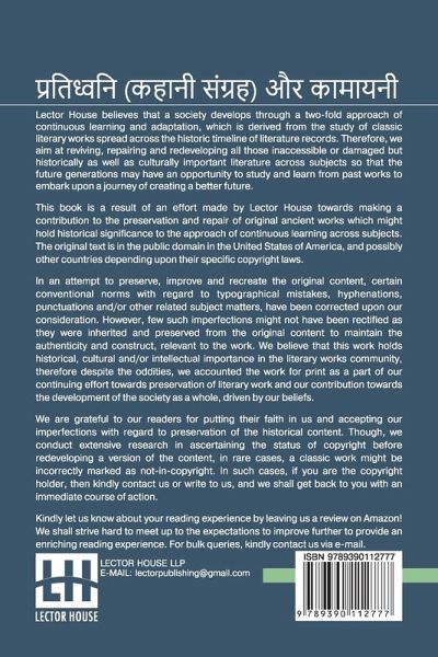 Pratidhwani (Kahani Sangraha) Aur Kamayani This book is a result of an effort made by us towards making a contribution to the preservation and repair of original classic literature. In an attempt to preserve, improve and recreate the original content, we have worked towards: 1. Type-setting & Reformatting: The complete work has been re-designed via professional layout, formatting and type-setting tools to re-create the same edition with rich typography, graphics, high quality images, and table elements, giving our readers the feel of holding a 'fresh and newly' reprinted and/or revised edition, as opposed to other scanned & printed (Optical Character Recognition - OCR) reproductions. 2. Correction of imperfections: As the work was re-created from the scratch, therefore, it was vetted to rectify certain conventional norms with regard to typographical mistakes, hyphenations, punctuations, blurred images, missing content/pages, and/or other related subject matters, upon our consideration. Every attempt was made to rectify the imperfections related to omitted constructs in the original edition via other references. However, a few of such imperfections which could not be rectified due to intentional\unintentional omission of content in the original edition, were inherited and preserved from the original work to maintain the authenticity and construct, relevant to the work. We believe that this work holds historical, cultural and/or intellectual importance in the literary works community, therefore despite the oddities, we accounted the work for print as a part of our continuing effort towards preservation of literary work and our contribution towards the development of the society as a whole, driven by our beliefs. We are grateful to our readers for putting their faith in us and accepting our imperfections with regard to preservation of the historical content. HAPPY READING!