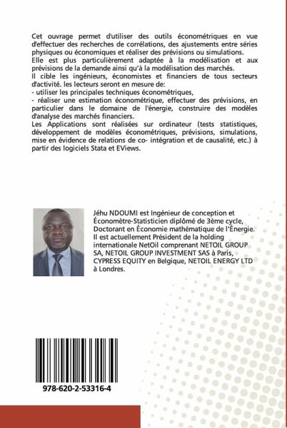 Cet ouvrage permet d'utiliser des outils économétriques en vue d'effectuer des recherches de corrélations, des ajustements entre séries physiques ou économiques et réaliser des prévisions ou simulations.Elle est plus particulièrement adaptée à la modélisation et aux prévisions de la demande ainsi qu'à la modélisation des marchés.Il cible les ingénieurs, économistes et financiers de tous secteurs d'activité. les lecteurs seront en mesure de:- utiliser les principales techniques économétriques,- réaliser une estimation économétrique, effectuer des prévisions, en particulier dans le domaine de l'énergie, construire des modèles d'analyse des marchés financiers.Les Applications sont réalisées sur ordinateur (tests statistiques, développement de modèles économétriques, prévisions, simulations, mise en évidence de relations de co- intégration et de causalité, etc.) à partir des logiciels Stata et EViews.