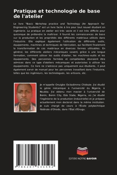 Le livre "Basic Workshop practice and Technology (An Approach for Engineering Students)" est un livre facile à lire pour tout nouvel étudiant en ingénierie. La pratique en atelier est très vaste et il est très difficile pour quiconque de prétendre la maîtriser. Il fournit les connaissances de base sur la production et les propriétés des différents matériaux utilisés dans l'industrie. Elle explique également l'utilisation de différents outils, équipements, machines et techniques de fabrication, qui facilitent finalement la transformation de ces matériaux en diverses formes utilisables. En général, les différents ateliers mécaniques savent, grâce à une longue formation, comment utiliser les outils d'atelier, les machines-outils et les équipements. Des personnes formées et compétentes devraient être admises dans ce type d'ateliers mécaniques et autorisées à utiliser les équipements. Ce livre ne s'adresse pas uniquement aux étudiants, il peut également servir de manuel pour les personnes travaillant dans l'industrie, telles que les ingénieurs, les technologues, les artisans, etc.