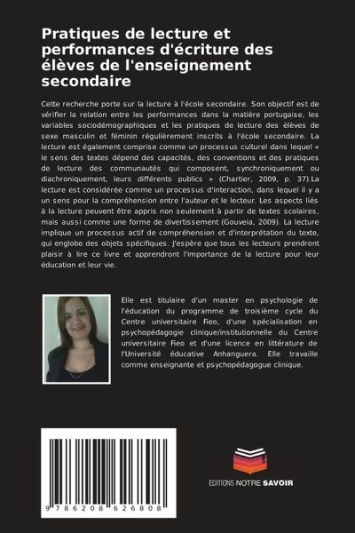 Cette recherche porte sur la lecture à l'école secondaire. Son objectif est de vérifier la relation entre les performances dans la matière portugaise, les variables sociodémographiques et les pratiques de lecture des élèves de sexe masculin et féminin régulièrement inscrits à l'école secondaire. La lecture est également comprise comme un processus culturel dans lequel « le sens des textes dépend des capacités, des conventions et des pratiques de lecture des communautés qui composent, synchroniquement ou diachroniquement, leurs différents publics » (Chartier, 2009, p. 37).La lecture est considérée comme un processus d'interaction, dans lequel il y a un sens pour la compréhension entre l'auteur et le lecteur. Les aspects liés à la lecture peuvent être appris non seulement à partir de textes scolaires, mais aussi comme une forme de divertissement (Gouveia, 2009). La lecture implique un processus actif de compréhension et d'interprétation du texte, qui englobe des objets spécifiques. J'espère que tous les lecteurs prendront plaisir à lire ce livre et apprendront l'importance de la lecture pour leur éducation et leur vie.