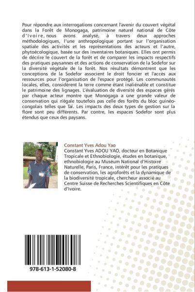 Pour répondre aux interrogations concernant l'avenir du couvert végétal dans la Forêt de Monogaga, patrimoine naturel national de Côte d'Ivoire, nous avons analysé, à travers deux approches méthodologiques, l'une anthropologique portant sur l'organisation spatiale des activités et les représentations des acteurs et l'autre, phytoécologique, basée sur des inventaires botaniques. Elles ont permis de décrire le couvert de la forêt et de comparer les impacts respectifs des pratiques paysannes et des actions de conservation de la Sodefor sur la diversité végétale de la forêt. Nos résultats démontrent que les conceptions de la Sodefor associent le droit foncier et l'accès aux ressources pour l'organisation de l'espace protégé. Les communautés locales, elles, considèrent la terre comme étant inaliénable et constitue le patrimoine des lignages. L'évaluation de diversité des espaces gérés par chaque acteur montre que Monogaga a une grande valeur de conservation qui n'égale toutefois pas celle des forêts du bloc guinéo-congolais telles que Taï. Les impacts des deux types de gestion sur la flore sont peu différents. Par contre, les espaces Sodefor sont plus étendus que ceux des paysans.