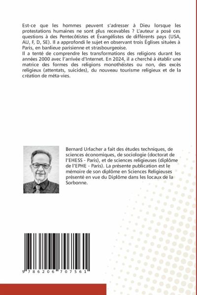 Est-ce que les hommes peuvent s'adresser à Dieu lorsque les protestations humaines ne sont plus recevables ? L'auteur a posé ces questions à des Pentecôtistes et Évangélistes de différents pays (USA, AU, F, D, SE). Il a approfondi le sujet en observant trois Églises situées à Paris, en banlieue parisienne et strasbourgeoise.Il a tenté de comprendre les transformations des religions durant les années 2000 avec l'arrivée d'Internet. En 2024, il a cherché à établir une matrice des formes des religions monothéistes ou non, des excès religieux (attentats, suicides), du nouveau tourisme religieux et de la création de méta-vies.