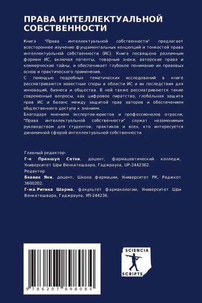 Kniga "Prawa intellektual'noj sobstwennosti" predlagaet wsestoronnee izuchenie fundamental'nyh koncepcij i tonkostej prawa intellektual'noj sobstwennosti (IS). Kniga poswqschena razlichnym formam IS, wklüchaq patenty, towarnye znaki, awtorskie prawa i kommercheskie tajny, i obespechiwaet glubokoe ponimanie ih prawowyh osnow i prakticheskogo primeneniq. S pomosch'ü podrobnyh tematicheskih issledowanij w knige rassmatriwaütsq izwestnye spory w oblasti IS i ih posledstwiq dlq innowacij, biznesa i obschestwa. V nej takzhe rassmatriwaütsq takie sowremennye woprosy, kak cifrowoe piratstwo, global'naq zaschita praw IS i balans mezhdu zaschitoj praw awtorow i obespecheniem obschestwennogo dostupa k znaniqm. Blagodarq mneniqm äxpertow-üristow i professionalow otrasli, "Prawa intellektual'noj sobstwennosti" sluzhat nezamenimym rukowodstwom dlq studentow, praktikow i wseh, kto interesuetsq dinamichnoj sferoj intellektual'noj sobstwennosti.