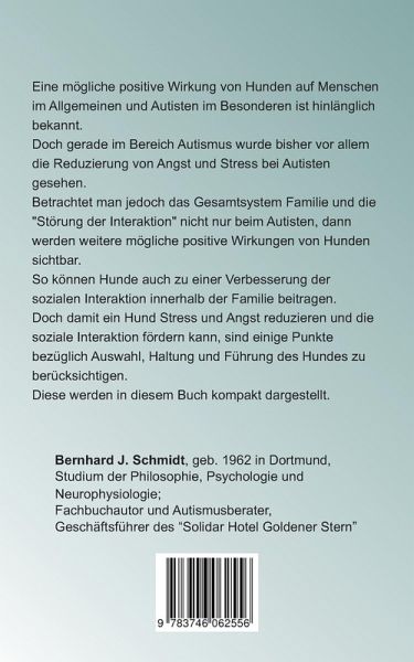 Eine mögliche positive Wirkung von Hunden auf Menschen im Allgemeinen und Autisten im Besonderen ist hinlänglich bekannt.Doch gerade im Bereich Autismus wurde bisher vor allem die Reduzierung von Angst und Stress bei Autisten gesehen.Betrachtet man jedoch das Gesamtsystem Familie und die "Störung der Interaktion" nicht nur beim Autisten, dann werden weitere mögliche positive Wirkungen von Hunden sichtbar.So können Hunde auch zu einer Verbesserung der sozialen Interaktion innerhalb der Familie beitragen.Doch damit ein Hund Stress und Angst reduzieren und die soziale Interaktion fördern kann, sind einige Punkte bezüglich Auswahl, Haltung und Führung des Hundes zu berücksichtigen.Diese werden in diesem Buch kompakt dargestellt.www.autismushunde.de ist die Homepage zum Buch.Weitere Informationen sowie die Liste meiner Veröffentlichungen zum Thema Autismus finden Sie aufwww.autismusberatung.info