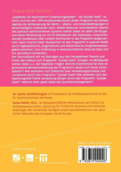 I. Praxis ohne Theorie? Zur Einführung.- Einführung: Praxis ohne Theorie? Wissenschaftliche Diskurse zum Bund-Länder-Programm "Stadtteile mit besonderem Entwicklungsbedarf - die Soziale Stadt".- Politische Steuerung der sozialen Stadtentwicklung: Ergebnisse des ersten Kolloquiums der Schader-Stiftung zum Programm "Soziale Stadt".- "Soziale Stadt" in der Praxis: Wirkungen und zukünftige Anforderungen.- II. Soziale Indikatoren und Evaluation.- Wie misst man soziale Maßnahmen?.- Programmfortschritt und erreichte Ergebnisse: Das Konzept für die Zwischenevaluation des Programms "Soziale Stadt" 2003/2004.- Zur Evaluation des Programms "Soziale Stadt": Das Programmgebiet Pliensauvorstadt/Esslingen am Neckar.- Das Wohnquartier als Bedingungsrahmen für gelingenden Alltag - Überlegungen zur Evaluation des Bund-Länder-Programms "Soziale Stadt" aus der Perspektive der Sozialen Arbeit.- III. Steuerung - Governance - Informations- und Wissensverarbeitung.- Irritation und Innovation: Stadterneuerung als Lernprozess?.- Soziale Stadtentwicklung - Widersprüche und Lernprozesse in der Politikimplementation.- Systemdenken und kollektive Wissensgenerierung: Die "Soziale Stadt" als Testfall modernen staatlichen Regierens.- Mehrebenenanalyse, Inkrementalismus und "Soziale Stadt".- Quartiermanagement im Spannungsfeld zwischen Politik, Verwaltung, Markt, Drittem Sektor und "Zivilgesellschaft".- Von Programmen zu Projekten: Die ambivalenten Innovationen des Quartiersmanagements.- Integrierte Stadtteilentwicklung: Bedeutung, Zusammenhang und Grenzen von Place-making, Sozialkapital und neuen Formen der Local Governance.- Fremdkörper im städtischen Management? Die institutionelle und thematische Einbindung der "Soziale-Stadt"-Projekte inHessen.- IV. Partizipation - Integration - soziale und politische Distanzen.- Aktivierung und Beteiligung im Rahmen der "Sozialen Stadt": Ein Klärungsversuch mit Hilfe von Sozialkapitalansätzen.- Stadtteil als sozialer Raum: Soziale und politische Distanzen in einem Stadtteil mit sozialem Erneuerungsbedarf.- Integration oder Ablenkungsmanöver? Zielsetzungen und Beitrag des Bund-Länder-Programms "Soziale Stadt" zur Integration sozialer Gruppen.- Politische Reintegration und das Leitbild der "Sozialen Stadt".- Kommunalpolitiker am Runden Tisch? Überlegungen zur Einbindung der Politik in das Programm "Soziale Stadt".- Kooperative Demokratie im Kiez? Beteiligung von intermediären Akteuren an der Stadtentwicklung in Nordrhein-Westfalen.- Lokale Politiknetzwerke: Konzeptionelle Überlegungen und erste Ergebnisse der Begleitforschung der "Sozialen Stadt" in Hessen.- Das Programm "Soziale Stadt": Komplexe Aufgabenbewältigung für Klein- und Mittelstädte in Bayern.- Die politique de la ville in Frankreich: Ein Blick auf mehr als zwanzig Jahre Soziale Stadtentwicklung.- Autoren.