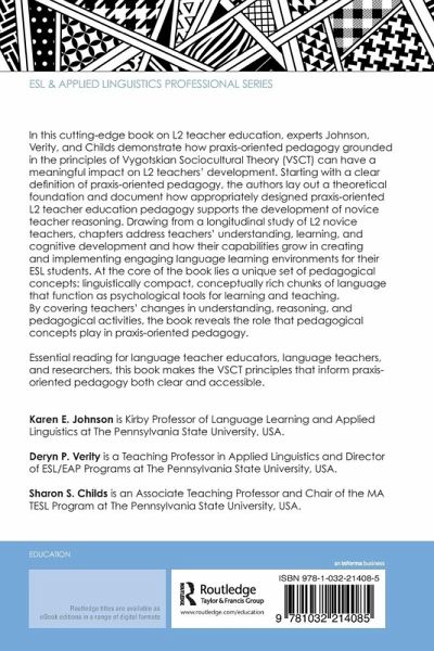 In this cutting-edge book on L2 teacher education, experts Johnson, Verity, and Childs demonstrate how praxis-oriented pedagogy grounded in the principles of Vygotskian Sociocultural Theory (VSCT) can have a meaningful impact on L2 teachers' development. Starting with a clear definition of praxis-oriented pedagogy, the authors lay out a theoretical foundation and document how appropriately designed praxis-oriented L2 teacher education pedagogy supports the development of novice teacher reasoning. Drawing from a longitudinal study of L2 novice teachers, chapters address the teachers' understanding, learning, and cognitive development and how their capabilities grow in creating and implementing engaging language learning environments for their ESL students. At the core of the book lies a unique set of pedagogical concepts: linguistically compact, conceptually rich chunks of language that function as psychological tools for learning and teaching. By covering teachers' changes inunderstanding, reasoning, and pedagogical activities, the book reveals the role that pedagogical concepts play in praxis-oriented pedagogy.