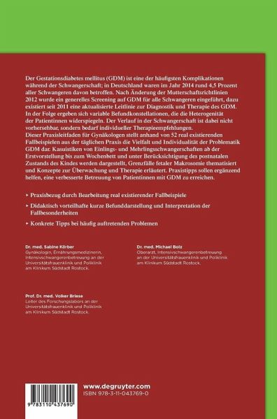Dieser Praxisleitfaden für Gynäkologen stellt anhand von 52 real existierenden Fallbeispielen aus der täglichen Praxis die Vielfalt und Individualität der Problematik GDM dar. Kasuistiken von Einlings- und Mehrlingsschwangerschaften ab der Erstvorstellung bis zum Wochenbett und unter Berücksichtigung des postnatalen Zustands des Kindes werden dargestellt, Grenzfälle fetaler Makrosomie thematisiert und Konzepte zur Überwachung und Therapie erläutert. Praxistipps sollen ergänzend helfen, eine verbesserte Betreuung von Patientinnen mit GDM zu erreichen.