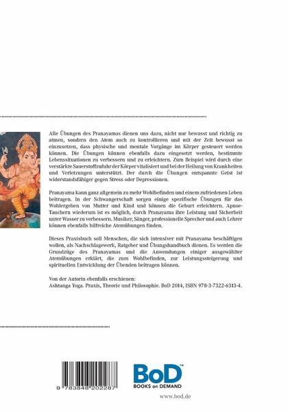 Alle Übungen des Pranayamas dienen uns dazu, nicht nur bewusst und richtig zu atmen, sondern den Atem auch zu kontrollieren und mit der Zeit bewusst so einzusetzen, dass physische und mentale Vorgänge im Körper gesteuert werden können. Die Übungen können aber auch dazu eingesetzt werden, bestimmte Lebenssituationen zu verbessern und zu erleichtern. Zum Beispiel wird durch eine verstärkte Sauerstoffzufuhr der Körper vitalisiert und bei der Heilung von Krankheiten und Verletzungen unterstützt. Der durch die Übungen entspannte Geist ist widerstandsfähiger gegen Stress oder Depressionen.Pranayama kann ganz allgemein zu mehr Wohlbefinden und einem zufriedenen Leben beitragen. In der Schwangerschaft sorgen einige spezifische Übungen für das Wohlergehen von Mutter und Kind und können die Geburt erleichtern. Apnoe-Tauchern wiederum ist es möglich, durch Pranayama ihre Leistung und Sicherheit unter Wasser zu verbessern. Musiker, Sänger, professionelle Sprecher und auch Lehrer können ebenfalls hilfreiche Atemübungen finden.Dieses Praxisbuch soll Menschen, die sich intensiver mit Pranayama beschäftigen wollen, als Nachschlagewerk, Ratgeber und Übungshandbuch dienen. Es werden die Grundzüge des Pranayamas und die Anwendungen einiger ausgewählter Atemübungen erklärt, die zum Wohlbefinden, zur Leistungssteigerung und spirituellen Entwicklung der Übenden beitragen können.Von der Autorin ebenfalls erschienen:Ashtanga Yoga. Praxis, Theorie und Philosophie. BoD 2014, ISBN 978-3-7322-6313-4.