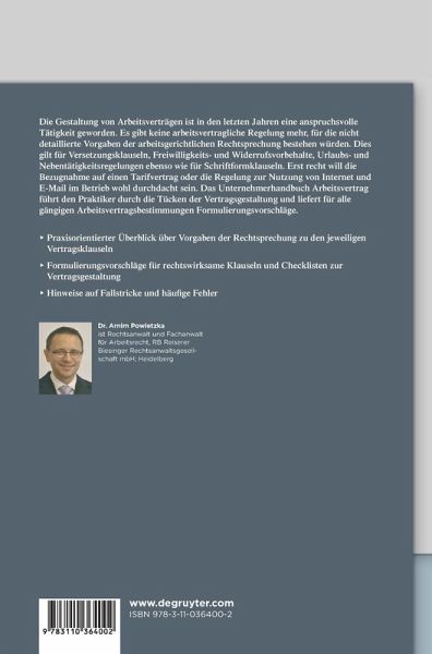 Das Unternehmerhandbuch führt den Praktiker im Betrieb und den Rechtsanwalt durch den Dschungel der Rechtsprechung, wenn es um die Gestaltung von Arbeitsverträgen geht. Das Werk zeigt, welche rechtlichen Rahmenbedingungen für einzelne Vertragsklauseln gelten, wie rechtssichere Regelungen formuliert werden können und welche Spielräume bestehen.