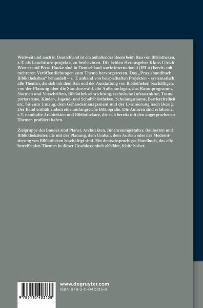 Weltweit und auch in Deutschland ist ein anhaltender Boom beim Bau von Bibliotheken, z.T. als Leuchtturmprojekte, zu beobachten. Die beiden Herausgeber Klaus Ulrich Werner und Petra Hauke sind in Deutschland sowie international (IFLA) bereits mit mehreren Veröffentlichungen zum Thema hervorgetreten. Das "Praxishandbuch Bibliotheksbau" behandelt - z. T. anhand von beispielhaften Projekten - systematisch alle Themen, die sich mit dem Bau und der Ausstattung von Bibliotheken beschäftigen: von der Planung über die Standortwahl, die Außenanlagen, das Raumprogramm, Normen und Vorschriften, Bibliothekseinrichtung, technische Infrastruktur, Transportsysteme, Kinder-, Jugend- und Schulbibliotheken, Schulungsräume, Barrierefreiheit etc. bis zum Umzug, dem Gebäudemanagement und der Evaluierung nach Bezug. Der Band enthält zudem eine umfangreiche Bibliografie. Die Autoren sind erfahrene, z.T. namhafte Architekten und Bibliothekare, die sich bereits mit den angesprochenen Themen profiliert haben.