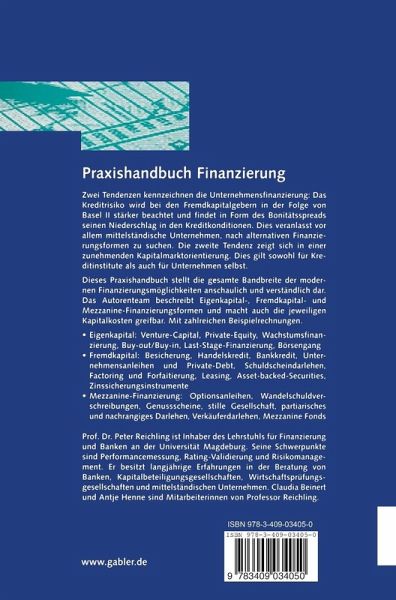 "Die Autoren richten sich an Studenten, aber vor allem auch an Praktiker, die ein gut strukturiertes und mit vielen anschaulichen Beispielen versehenes Fachbuch erhalten." Brsede-Magazin, 28.04.2006 "Zahlreiche konkret durchgerechnete Beispiele illustrieren nicht nur die Auswirkungen auf die Liquidität, sondern auch den Jahresabschluss von Unternehmen. Insofern versteht sich das Buch zu Recht als Ratgeber der Vertreter von Wissenschaft und Praxis, denen es zur Lektüre empfohlen werden kann." Die Bank, 03/2006 "Das 'Praxishandbuch Finanzierung' erleichtert Firmenchefs die Suche nach alternativen Finanzierungsformen - von Venture-Capital und Private Equity über Factoring und Forfaitierung bis hin zu Wandelschuldverschreibungen und Mezzanine-Fonds." Impulse, 02/2006