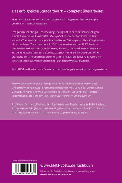 Imagery Rescripting & Reprocessing Therapy ist in der deutschsprachigen Psychotherapie inzwischen weit verbreitet. Mervyn Schmucker entwickelte die IRRT ursprünglich zur schonenden Trauma-Konfrontation. Belastende Bilder und tief sitzende Blockaden werden mit imaginativen Mitteln transformiert, um eine emotionale Bewältigung zu erreichen. Zusammen mit Rolf Köster übertrug er diese Methode auf andere Störungen mit Verarbeitungsblockaden: Bei Anpassungsstörungen, Ängsten, Depressionen, anhaltender Trauer und Störungen des Selbstbezugs (IRRT Innere-Kind-Arbeit) eröffnen sich neue Behandlungsmöglichkeiten. Anhand ausführlicher Fallgeschichten erschließt sich das Verfahren in seiner ganzen Anwendungsbreite.
