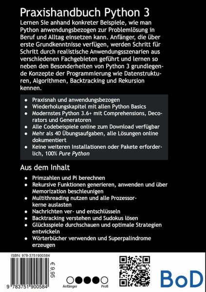 Wer die Grundlagen von Python beherrscht und jetzt tiefer einsteigen möchte, kommt in diesem Buch auf seine Kosten. Mittels konkreter Anwendungsbeispiele aus verschiedenen Fachgebieten wird aufgezeigt, wie man Python produktiv zur Problemlösung einsetzen kann. Diskutiert werden dabei neben den allgemeinen Lösungsideen auch die Spezifika von Python und wie diese gewinnbringend genutzt werden können. Somit veranschaulicht das Buch allgemeine Konzepte der Programmierung, wie beispielsweise Algorithmen, Rekursion und Datenstrukturen, und lehrt problemorientiertes Denken.