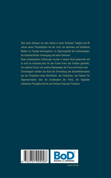 Über einen Zeitraum von zehn Jahren in seiner klinischen Tätigkeit und 35 Jahren seiner Praxistätigkeit hat der Autor die stationäre und ambulante Medizin zur Genüge kennengelernt, im Spannungsfeld der Krankenkassen, der kassenärztlichen Vereinigung und seiner Patienten. Diese umfangreichen Erfahrungen wurden in diesem Buch gesammelt und es wird sie erstaunen,was mit den Ärzten hinter den Kulissen geschieht, mit welchem Druck und welchen Repressalien die Ärzte konfrontiert sind. Chronologisch schildert das Buch die Entwicklung des Gesundheitswesens aus der Perspektive eines Betroffenen, des Klinikarztes, des Facharzt für Allgemeinmedizin über die Gründerjahre der Praxis, der folgenden turbulenten Praxisjahre bis hin zum bitteren Ende, dem Praxistod