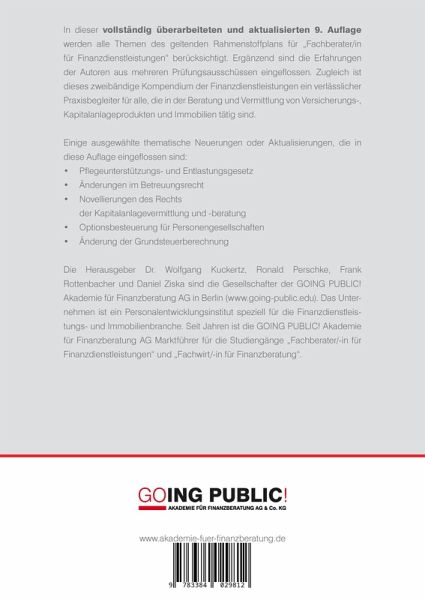 Ein Buch, das auf die IHK-Weiterbildungsprüfung "Fachberater/in für Finanzdienstleistungen" vorbereitet und gleichzeitig "Praxiswissen Finanzdienstleistungen" heißt - widerspricht sich das nicht?Dieses Buch zeigt Ihnen, dass dem nicht so ist:1.Der Rahmenstoffplan des in der Finanzdienstleistungsbranche etablierten, öffentlich-rechtlichen Weiterbildungsabschlusses "Fachberater/in für Finanzdienstleistungen" ist von vielen Praktikern erarbeitet worden. Dabei wurde auf eine hohe Praxisrelevanz der Inhalte geachtet und dem Allfinanzgedanken Rechnung getragen. Damit sind die Inhalte äußerst aktuell und wichtig für jeden, der täglich mit Kunden umgeht und diese berät. Dadurch, dass sich die Inhalte dieses Buches am Rahmenlehrplan orientieren, decken sie gleichzeitig sehr viele Themen der Beratungspraxis ab.2.Dieses Buch ist so geschrieben, dass Sie es sowohl zur gezielten Prüfungsvorbereitung als auch in der Praxis als ständigen Begleiter einsetzen können. Aufbauend auf unserer Erfahrung aus über drei Jahrzehnten in Schulungen und Seminaren für Banken, Versicherungs-, Immobilien- und Vertriebsunternehmen von Finanzdienstleistungen, werden Ihnen in den einzelnen Kapiteln nicht nur die Produkte unternehmensunabhängig erläutert, sondern auch rechtliche Grundlagen sowie wertvolle Tipps für die Praxis gegeben. Ein ausführliches Stichwortverzeichnis ermöglicht ein schnelles Auffinden von Themengebieten.3.Die Herausgeber Dr. Wolfgang Kuckertz, Ronald Perschke und Frank Rottenbacher sind Vorstände der Berliner GOING PUBLlC! Akademie für Finanzberatung AG (www.akademie-fuer-finanzberatung.de), dem bundesweit führenden Anbieter von Vorbereitungsstudiengängen zum/-r "Fachberater/in für Finanzdienstleistungen (IHK)" sowie "Fachwirt/in für Finanzberatung (IHK)". Daniel Ziska ist als Steuerberater Vorstand der Berliner GPC Unternehmer- und Steuerberatungsgesellschaft AG, deren Mandantschaft ebenfalls schwerpunktmäßig aus dem Finanzdienstleistungsbereich kommt.