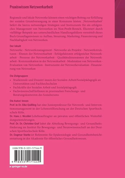 Netzwerke.- Netzwerkmanagement.- Netzwerke als Projekte.- Netzwerkstrukturen.- Ebenen der Netzwerkarbeit.- Erfolgsfaktoren erfolgreicher Netzwerkarbeit.- Prozesse der Netzwerkarbeit.- Qualitätsdimensionen der Netzwerkarbeit.- Kommunikation in der Netzwerkarbeit.- Moderation von Netzwerken.- Evaluation von Netzwerken.- Instrumente der Netzwerkevaluation.- Finanzierung von Netzwerken.