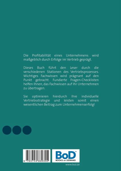 Die Profitabilität eines Unternehmens wird maßgeblich durch Erfolge im Vertrieb geprägt. Dieses Buch führt den Leser durch die verschiedenen Stationen des Vertriebsprozesses. Wichtiges Fachwissen wird prägnant auf den Punkt gebracht. Fundierte Fragen-Checklisten helfen Ihnen, das Fachwissen auf Ihr Unternehmen zu übertragen. Sie optimieren hierdurch Ihre individuelle Vertriebsstrategie und leisten somit einen wesentlichen Beitrag zum Unternehmenserfolg!