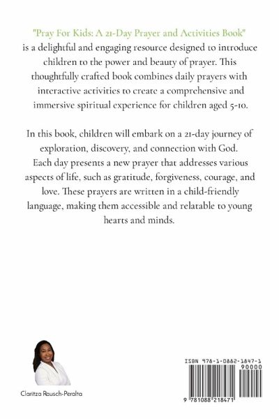 Pray For Kids: A 21-Day Prayer and Activities Book" is a delightful and engaging resource designed to introduce children to the power and beauty of prayer. This thoughtfully crafted book combines daily prayers with interactive activities to create a comprehensive and immersive spiritual experience for children aged 5-10. In this book, children will embark on a 21-day journey of exploration, discovery, and connection with God. Each day presents a new prayer that addresses various aspects of life, such as gratitude, forgiveness, courage, and love. These prayers are written in a child-friendly language, making them accessible and relatable to young hearts and minds. Whether used individually or as part of a group setting, "Pray. For Kids" is a valuable tool that nurtures the spiritual growth of children. It instills a sense of awe, wonder, and gratitude, helping young hearts connect with the Divine and discover the transformative power of prayer.