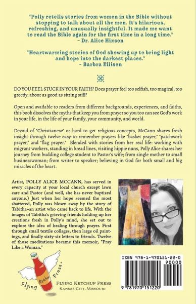 Open and available to readers from different backgrounds, experiences, and faiths, this book dissolves the myths that keep you from prayer so you too can see God's work in your life, in the life of your family, your community, and world. Devoid of "Christianese" or hard-to-get religious concepts, McCann shares fresh insight through twelve easy-to-remember prayers like "basket prayer," "patchwork prayer," and "flag prayer." Blended with stories from her real life: working with migrant workers, standing in bread lines, visiting hippie nuns, Polly Alice shares her journey from budding college student to Pastor's wife; from single mother to small businesswoman; from writer to speaker; believing in God for both small and big miracles of the heart. Artist, Polly Alice McCann, has served in every capacity at your local church except lawn care and Pastor (and well, she has never baptized anyone.) Just when her hope seemed the most shattered, Polly was blown away by the story of Tabitha-an artist who came back to life. With the images of Tabitha's grieving friends holding up her creations fresh in Polly's mind, she set out to explore the idea of healing through prayer. First through small textile collages, then large oil paintings, and finally sixty-six letters to friends. Twelve of those meditations became this memoir, "Pray Like a Woman."