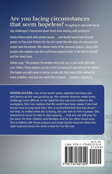 Are you facing circumstances that seem hopeless? Struggling to cope with day to day challenges? Concerned about loved ones dealing with problems? Deidra Ahlers dealt with similar issues . . . and finally found help through prayer. In Pray, Lost Children, for You Are Loved she tells how she learned that prayer was the answer. She shares many of her personal prayers, along with prayers she realizes now she could have prayed earlier in her life for her sons, her siblings, and others in her life. Deidra says, "The prayers I've written are to aid you in your walk with God, your Father. All the prayers in this book can be for all people and were written for everyone, no matter their circumstances. These prayers can be a tool in praying for yourself and for others." God wants a relationship with you. He wants to hear your hopes, your needs, and your intercession for others. He wants you to simply talk with Him in sincerity and authenticity about your feelings and everything in your life. Eloquent words are not necessary when you pray. God, viewing you as His child with His overflowing love, looks at your heart-your intentions-in prayer. He already knows what you're thinking, and prayer is an opportunity to be honest and relational with Him. In your own words, simply share with Him what's going on in your life, how you feel, and what you desire. Ask Him for your desires and for the help you need and do the same on behalf of others. Deidra hopes you will come to realize, as she did, that Jesus is the answer to every problem-and you can meet Him in prayer . . . anytime, anywhere.