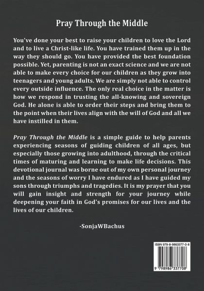 You've done your best to raise your children to love the Lord and to live a Christ-like life. You have trained them up in the way they should go. You have provided the best foundation possible. Yet, parenting is not an exact science and we are not able to make every choice for our children as they grow into teenagers and young adults. We are simply not able to control every outside influence. The only real choice in the matter is how we respond in trusting the all-knowing and sovereign God. He alone is able to order their steps and bring them to the point when their lives align with the will of God and all we have instilled in them. Pray Through the Middle is a simple guide to help parents experiencing seasons of guiding children of all ages, but especially those growing into adulthood, through the critical times of maturing and learning to make life decisions. This devotional journal was borne out of my own personal journey and the seasons of worry I have endured as I have guided my sons through triumphs and tragedies. It is my prayer that you will gain insight and strength for your journey while deepening your faith in God's promises for our lives and the lives of our children. -SonjaWBachus