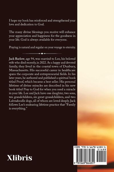 I hope my book has reinforced and strengthened your love and dedication to God. The many divine blessings you receive will enhance your appreciation and happiness for the goodness in your life. God is always available for everyone. Praying is natural and regular on your voyage to eternity.