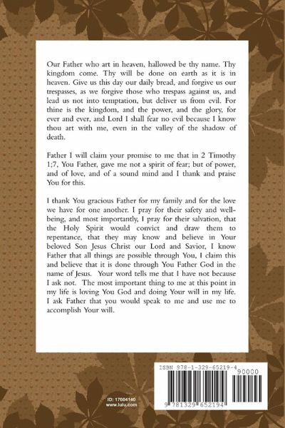 Our Father who art in heaven, hallowed be thy name. Thy kingdom come. Thy will be done on earth as it is in heaven. Give us this day our daily bread, and forgive us our trespasses, as we forgive those who trespass against us, and lead us not into temptation, but deliver us from evil. For thine is the kingdom, and the power, and the glory, for ever and ever, and Lord I shall fear no evil because I know thou art with me, even in the valley of the shadow of death. Father I will claim your promise to me that in 2 Timothy 1;7, You Father, gave me not a spirit of fear; but of power, and of love, and of a sound mind and I thank and praise You for this. I ask Your continued blessing on our country and pray You would lead and guide our leaders to make decisions that would be in Your will and not their own.