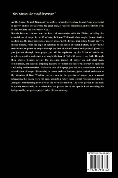 "God shapes the world by prayer."As The Sunday School Times aptly describes, Edward McKendree Bounds "was a specialist in prayer, and his books are for the quiet hour, for careful meditation, and for all who wish to seek and find the treasures of God."Bounds beckons readers into the heart of communion with the Divine, unveiling the essential role of prayer in the life of every believer. With meticulous insight, Bounds invites readers into the inner sanctum of prayer, exploring the lives of men whose fervent prayers shaped history. From the pages of Scripture to the annals of church history, he unveils the transformative power of prayer through the lives of biblical heroes and spiritual giants. As you journey through these pages, you will be captivated by the fervor of patriarchs, prophets, apostles, and saints who sought the face of God with unwavering faith. Through their stories, Bounds reveals the profound impact of prayer on individual lives, communities, and nations, inspiring readers to embark on their own journey of spiritual awakening and intercession. With each turn of the page, you will be drawn deeper into the sacred realm of prayer, discovering its power to shape destinies, ignite revival, and usher in the kingdom of God. Whether you are new to the practice of prayer or a seasoned intercessor, this classic work will guide you into a richer, more vibrant relationship with the Almighty, transforming your life and the world around you. The latter portion of the book is equally remarkable, as it delves into the prayer life of the apostle Paul, revealing the indispensable role prayer played in his life and ministry. "How greatly we need a school to teach the art of praying! This simplest of all arts and mightiest of all forces is ever in danger of being forgotten or depraved. The further we get away from our mother's knees, the further do we get away from the true art of praying. All our after-schooling and our after-teachers unteach us the lessons of prayer. Men prayed well in Old Testament times because they were simple men and lived in simple times. They were childlike, lived in childlike times and had childlike faith.In citing the Old Testament saints noted for their praying habits, by no means must David be overlooked, a man who preeminently was a man of prayer. With him prayer was a habit, for we hear him say, "Evening and morning and at noon will I pray and cry aloud." Prayer with the Sweet Psalmist of Israel was no strange occupation. He knew the way to God and was often found in that way. It is no wonder we hear his call so clear and impressive, "O come, let us worship and bow down; let us kneel before the Lord our Maker." He knew God as the one being who could answer prayer: "O thou that hearest prayer, to thee shall all flesh come."