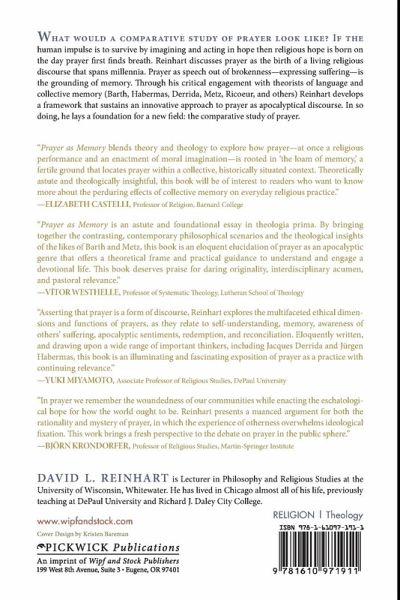 What would a comparative study of prayer look like? If the human impulse is to survive by thinking and acting religiously, Reinhart says religion is born on the day prayer first finds breath. He discusses prayer as a discourse since that first day that is speech out of brokenness or suffering is expressed in the hope of something more. Through his engagement with theorists of language and memory (Habermas, Derrida, Metz, Ricoeur, and others), Reinhart develops a framework that sustains an innovative approach to apocalyptical thought that also lays the foundation for a new field: the comparative study of prayer.