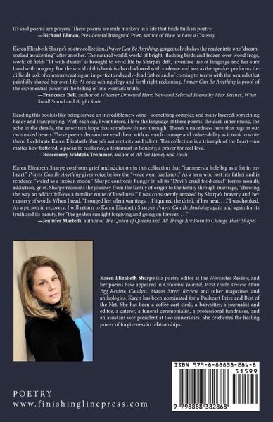 It's said poems are prayers. These poems are mile markers in a life that finds faith in poetry.-Richard Blanco, Presidential Inaugural Poet, author of How to Love a Country Karen Elizabeth Sharpe's poetry collection, Prayer Can Be Anything, gorgeously shakes the reader into one "dream-soaked awakening" after another. The natural world, world of bright- flashing birds and frozen-over wood frogs, world of fields "lit with daisies" is brought to vivid life by Sharpe's deft, inventive use of language and her sure hand with imagery. But the world of this book is also shadowed with violence and loss as the speaker performs the difficult task of commemorating an imperfect and early-dead father and of coming to terms with the wounds that painfully shaped her own life. At once aching elegy and forthright reckoning, Prayer Can Be Anything is proof of the exponential power in the telling of one woman's truth.-Francesca Bell, author of Whoever Drowned Here: New and Selected Poems by Max Sessner, What Small Sound and Bright Stain Reading this book is like being served an incredible new wine-something complex and many layered, something heady and transporting. With each sip, I want more. I love the language of these poems, the dark inner music, the ache in the details, the unwritten hope that somehow shines through. There's a nakedness here that tugs at our own naked hearts. These poems demand we read them with as much courage and vulnerability as it took to write them. I celebrate Karen Elizabeth Sharpe's authenticity and talent. This collection is a triumph of the heart-no matter how battered, a paean to resilience, a testament to honesty, a prayer for real love.-Rosemerry Wahtola Trommer, author of All the Honey and Hush Karen Elizabeth Sharpe confronts grief and addiction in this collection that "hammers a hole big as a fist in my heart." Prayer Can Be Anything gives voice before the "voice went bankrupt." As a teen who lost her father and is rendered "weird as a broken moon," Sharpe confronts hunger in all its "Devil's cruel food cruel" forms: assault, addiction, grief. Sharpe recounts the journey from the family of origin to the family through marriage, "chewing the way an addict/follows a familiar route of loneliness." I was consistently amazed by Sharpe's bravery and her mastery of words. When I read, "I songed her silent wantings. . .I liquored the drink of her heat. . . ," I was hooked. As a person in recovery, I will return to Karen Elizabeth Sharpe's Prayer Can Be Anything again and again for its truth and its beauty, for "the golden sunlight forgiving and going on forever. . . ."-Jennifer Martelli, author of The Queen of Queens and All Things Are Born to Change Their Shapes