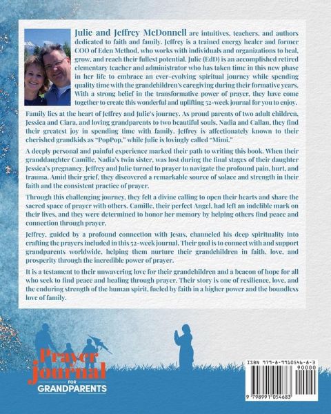 Prayer Journal for Grandparents: 52 Weeks Scripture, Devotional, & Guided Prayer Journal is more than just a book. It's a tool to strengthen your family's faith and bond. It includes 52 heart-inspired prayers for you to pray for your grandchildren, 104 Bible verses that are aligned with the inspired prayers, and 208 unique Journaling prompts designed to help guide your prayer time each week. The Inspired Prayers and Bible Verses are organized into six themes:Faith & Miracles Love & Comfort Joy & Wonder Gratitude & Praise Grace & Forgiveness Wisdom & Purpose A perfect prayer companion for individual or group prayer time! This 52-week journal features:A uniquely Inspired Prayer by Jeffrey and Julie aligned with one of the six core themes. Two Bible Verses that support the Inspired Prayer for your weekly reflection, meditation, and prayer on the Creator's words A generous two full-page Journaling space per week with four guided prompts based on the concept created by Jeffrey and Julie, called REAP (Reflect, Express, Act, & Praise). Designed to elevate your two-way communication with the Divine. A My Prayers section where you can document and track when and how your prayers were answered and witness how the Creator moves in and through your life over the 52 weeks.