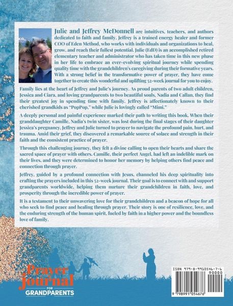 Prayer Journal for Grandparents: 52 Weeks Scripture, Devotional, & Guided Prayer Journal is more than just a book. It's a tool to strengthen your family's faith and bond. It includes 52 heart-inspired prayers for you to pray for your grandchildren, 104 Bible verses that are aligned with the inspired prayers, and 208 unique Journaling prompts designed to help guide your prayer time each week. The Inspired Prayers and Bible Verses are organized into six themes:Faith & Miracles Love & Comfort Joy & Wonder Gratitude & Praise Grace & Forgiveness Wisdom & Purpose A perfect prayer companion for individual or group prayer time! This 52-week journal features:A uniquely Inspired Prayer by Jeffrey and Julie aligned with one of the six core themes. Two Bible Verses that support the Inspired Prayer for your weekly reflection, meditation, and prayer on the Creator's words A generous two full-page Journaling space per week with four guided prompts based on the concept created by Jeffrey and Julie, called REAP (Reflect, Express, Act, & Praise). Designed to elevate your two-way communication with the Divine. A My Prayers section where you can document and track when and how your prayers were answered and witness how the Creator moves in and through your life over the 52 weeks.