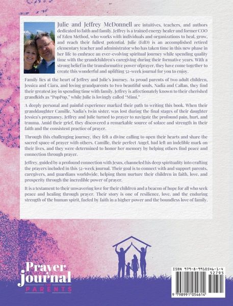 Prayer Journal for Parents: 52 Weeks Scripture, Devotional, & Guided Prayer Journal is more than just a book. It's a tool to strengthen your family's faith and bond. It includes 52 heart-inspired prayers for you to pray for your children, 104 Bible verses that are aligned with the inspired prayers for reflection on the Creator's words, and 208 unique Journaling prompts designed to help guide your prayer time each week. The Inspired Prayers and Bible Verses are organized into six themes:Faith & Miracles Love & Comfort Joy & Wonder Gratitude & Praise Grace & Forgiveness Wisdom & Purpose A perfect prayer companion for individual or group prayer time! This 52-week journal features:A uniquely Inspired Prayer by Jeffrey and Julie aligned with one of the six core themes. Two Bible Verses that support the Inspired Prayer for your weekly reflection, meditation, and prayer on the Creator's words A generous two full-page Journaling space per week with four guided prompts based on the concept created by Jeffrey and Julie, called REAP (Reflect, Express, Act, & Praise). Designed to elevate your two-way communication with the Divine. A My Prayers section where you can document and track when and how your prayers were answered and witness how the Creator moves in and through your life over the 52 weeks.