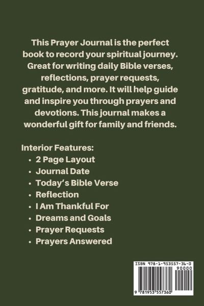 This Prayer Journal is the perfect book to record your spiritual journey. Great for writing daily Bible verses, reflections, prayer requests, gratitude, and more. It will help guide and inspire you through prayers and devotions. This journal makes a wonderful gift for family and friends. Features:Journal Date Today's Bible Verse Reflection I Am Thankful For Dreams and Goals Prayer Requests Prayers Answered Details:Size: 6" x 9" Pages: 104 Paperback Matte finish Order this book today to start recording your daily prayers and devotions! Makes a great gift for bible study groups, prayer warriors, family, and friends.