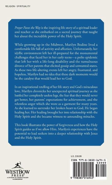 Prayer Paves the Way is the inspiring life story of a spiritual leader and teacher as she embarked on a sacred journey that taught her about the incredible power of the Holy Spirit. While growing up in the Midwest, Marilyn Bodine lived a comfortable life full of activity and affection. Unfortunately, her idyllic environment left her ill-prepared for the monumental challenges that faced her in her early teens-a polio epidemic that left her with a life-long disability and the tumultuous divorce of her parents that elicited gossip and unwanted stares. As these two life-altering events left her angry, frustrated, and hopeless, Marilyn had no idea that these dark moments would be the catalyst that would lead her to God. In an inspirational retelling of her life story and God's miraculous love, Marilyn chronicles her unexpected spiritual journey as she battled her completely useless legs, the fear that they would never get better, her parents' expectations for achievement, and the relentless anger which she wore as a garment for many years. As she learned to surrender her broken heart to God, He began healing her. Her healing brought her into relationship with the Holy Spirit and she became witness to astounding miracles. This book illustrates the power of forgiveness and how the Holy Spirit guides us if we allow Him. Marilyn's experiences have the potential to lead seekers into a deeper relationship with Jesus and the Holy Spirit.