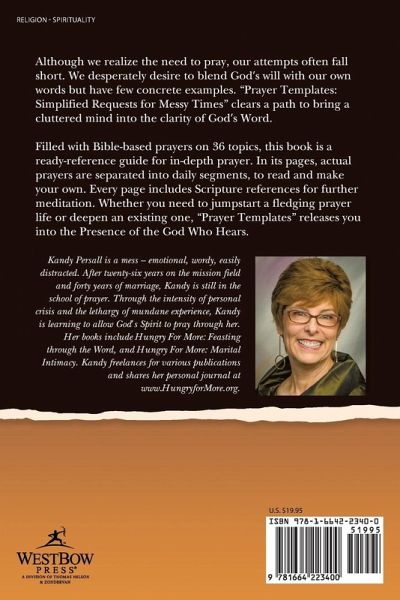 Although we realize the need to pray, our attempts often fall short. We desperately desire to blend God's will with our own words but have few concrete examples. "Prayer Templates: Simplified Requests for Messy Times" clears a path to bring a cluttered mind into the clarity of God's Word. Filled with Bible-based prayers on 36 topics, this book is a ready-reference guide for in-depth prayer. In its pages, actual prayers are separated into daily segments, to read and make your own. Every page includes Scripture references for futher meditation. Whether you need to jumpstart a fledging prayer life or deepen an existing one, "Prayer Templates releases you into the Presence of the God Who Hears.