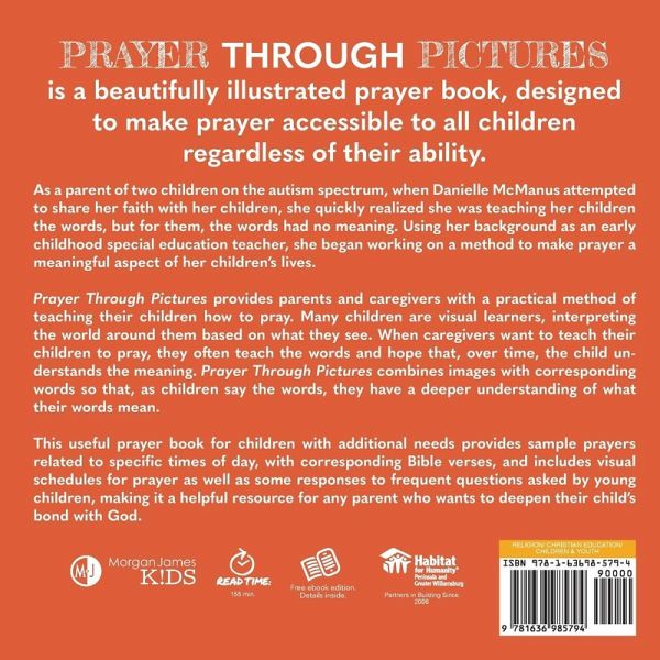 Prayer Through Pictures is a beautifully illustrated prayer book, designed to make prayer accessible to all children regardless of their ability. As a parent of two children on the autism spectrum, when Danielle McManus attempted to share her faith with her children, she quickly realized she was teaching her children the words, but for them, the words had no meaning. Using her background as an early childhood special education teacher, she began working on a method to make prayer a meaningful aspect of her children's lives. Prayer Through Pictures provides parents and caregivers with a practical method of teaching their children how to pray. Many children are visual learners, interpreting the world around them based on what they see. When caregivers want to teach their children to pray, they often teach the words and hope that, over time, the child understands the meaning. Prayer Through Pictures combines images with corresponding words so that, as children say the words, they have a deeper understanding of what their words mean. This useful prayerbook for children with additional needs provides sample prayers related to specific times of day, with corresponding Bible verses, and includes visual schedules for prayer as well as some responses to frequent questions asked by young children, making it a helpful resource for any parent who wants to deepen their child’s bond with God.