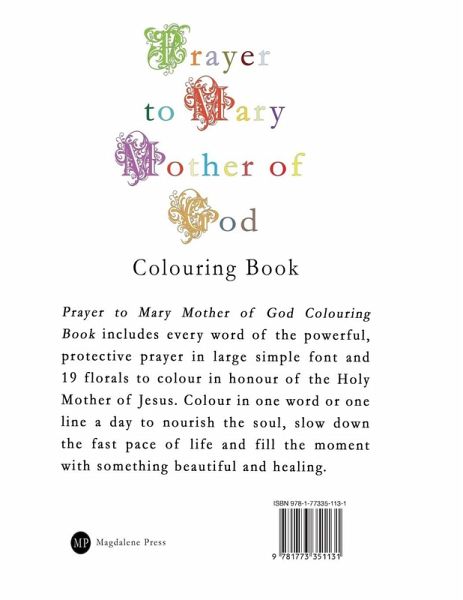Prayer to Mary Mother of God Colouring Book includes every word of the powerful, protective prayer in large simple font and 19 florals to colour in honour of the Holy Mother of Jesus. Colour in one word or one line a day to nourish the soul, slow down the fast pace of life and fill the moment with something beautiful and healing. Exact text within: To thee, O Mother of God, victorious leader of triumphant hosts, we, thy servants, delivered from evil, sing our grateful thanks: but since thou possessest invincible might, set us free from every calamity that we may cry unto thee: Hail, O Bride Unwedded. Most glorious ever-virgin Mother of Christ, our God, bring our prayer unto thy Son and our God, that by thee He may save our souls. All my hope I lay upon thee, Divine Mother, preserve me beneath thy protection. O Virgin Mother of God, despise me not, a sinner, who seek thy help and thy intercession; for in thee hath my soul hoped; have mercy upon me. Product information: Matte cover finish, 70 lbs quality interior paper for marker, crayon and color pencil use.