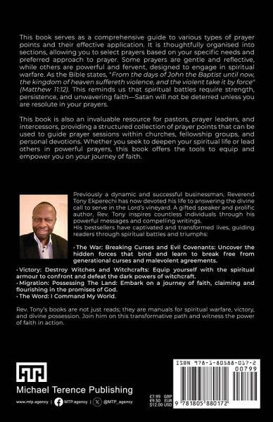 This book serves as a comprehensive guide to various types of prayer points and their effective application. It is thoughtfully organised into sections, allowing you to select prayers based on your specific needs and preferred approach to prayer. Some prayers are gentle and reflective, while others are powerful and fervent, designed to engage in spiritual warfare. As the Bible states, "From the days of John the Baptist until now, the kingdom of heaven suffereth violence, and the violent take it by force" (Matthew 11:12). This reminds us that spiritual battles require strength, persistence, and unwavering faith-Satan will not be deterred unless you are resolute in your prayers. This book is also an invaluable resource for pastors, prayer leaders, and intercessors, providing a structured collection of prayer points that can be used to guide prayer sessions within churches, fellowship groups, and personal devotions. Whether you seek to deepen your spiritual life or lead others in powerful prayers, this book offers the tools to equip and empower you on your journey of faith.
