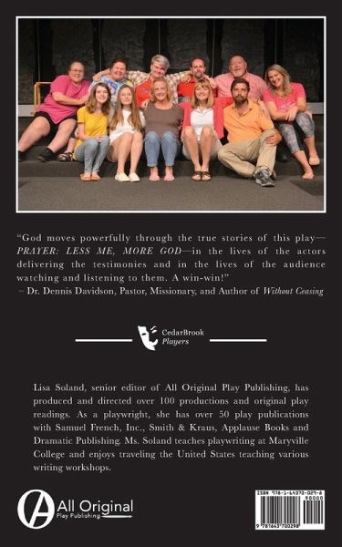 Prayer: Less Me, More God was first performed in the Hub on the campus of West Park Baptist Church in Knoxville, Tennessee, on July 26, 2019. The material for Prayer: Less Me, More God was developed in an Acting/Writing Workshop led and directed by Lisa Soland. This play is the result of nine interviews with real people, conducted by the original participants. The stories illustrate the impact prayer has in people's lives. MONOLOGUES PRAYER'S PROTECTION written and originally performed by Nancy Rolen ACCEPTANCE written and originally performed by Austin Percival FROM HUNGARY TO HEAVEN written and originally performed by Cheryl Hodge GOD'S RELIEF written and originally performed by Stephen Polson I'M ALREADY HERE! written and originally performed by Abby Shamblin WHERE GOD BEGAN written and originally performed by David G. Gregory THE CRY OF THE SOUL written and originally performed by Camille Folden MY WHITE HORSE written and originally performed by Shawn Williams MORE THAN I CAN HANDLE written and originally performed by Kim Dunivant