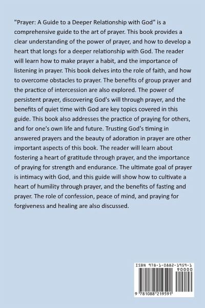 "Prayer: A Guide to a Deeper Relationship with God" is a comprehensive guide to the art of prayer. This book provides a clear understanding of the power of prayer, and how to develop a heart that longs for a deeper relationship with God. The reader will learn how to make prayer a habit, and the importance of listening in prayer. This book delves into the role of faith, and how to overcome obstacles to prayer. The benefits of group prayer and the practice of intercession are also explored. The power of persistent prayer, discovering God's will through prayer, and the benefits of quiet time with God are key topics covered in this guide. This book also addresses the practice of praying for others, and for one's own life and future. Trusting God's timing in answered prayers and the beauty of adoration in prayer are other important aspects of this book. The reader will learn about fostering a heart of gratitude through prayer, and the importance of praying for strength and endurance. The ultimate goal of prayer is intimacy with God, and this guide will show how to cultivate a heart of humility through prayer, and the benefits of fasting and prayer. The role of confession, peace of mind, and praying for forgiveness and healing are also discussed. The beauty of blessing in prayer, and the importance of blessing others is a key part of this guide. The joy of singing praises to God, and the freedom of worship in prayer, as well as learning to pray through suffering are other important aspects of this book. "Prayer: A Guide to a Deeper Relationship with God" is a must-read for anyone looking to deepen their spiritual connection with God through prayer.