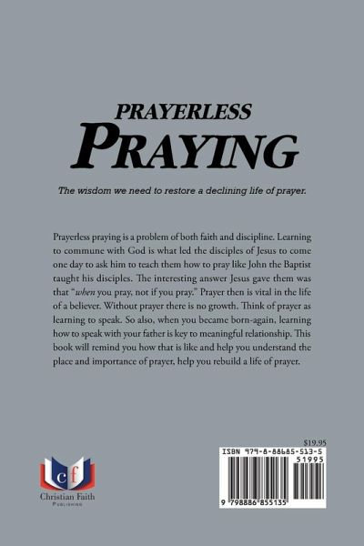 Prayerless Praying The Wisdom We Need to Rebuild a Life of Prayer Your prayer life needs just a little help. Prayerless praying is a problem of both faith and discipline. Learning to commune with God is what led the disciples of Jesus to come one day to ask him to teach them how to pray like John the Baptist taught his disciples. The interesting answer Jesus gave them was that "when you pray, not if you pray." Prayer then is vital in the life of a believer. Without prayer there is no growth. Think of prayer as learning to speak. So also, when you became born-again, learning how to speak with your father is key to meaningful relationship. This book will remind you how that is like and help you understand the place and importance of prayer, help you rebuild a life of prayer. Prayerless lives are powerless lives. Emmanuel has addressed issues at the very core of Christian living and has directed the reader to the truth of a peaceful, powerful life; that is prayer. --Kate Bougthon, dean of Emmanuel Bible Institute