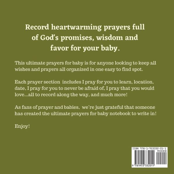 How To Use This Prayers For Baby Log Book: This ultimate prayers for baby keepsake notebook is a perfect way to track and record all your prayers, thoughts and memories. 8.5 X 8.5 Inches. 110 Pages. Each interior page includes prompts and space to record the following: I pray for you to learn - Write out your prayers and wishes for the baby in the space provided. I pray for you to never be afraid of - Record your thoughts and ideas for things you want for the baby. I pray you love - Track these memories for the baby as you write out special thoughts of what your wishes are for the baby as they grow. From - Sign here to and come back later to be reminded of wishes and prayers for the baby. If you are a new parent or have been doing this for a while, this prayer for baby journal is a must have! Can make an awesome gift for the new parent, and will be a keepsake memory forever. Convenient size of 8.25 X 6 inches, 110 pages, quality white paper, soft matte finish cover, paperback. Enjoy!