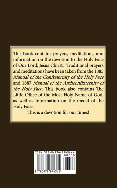This book contains prayers, meditations, and information on the devotion to the Holy Face of Our Lord, Jesus Christ. Traditional prayers and meditations have been taken from the 1885 Manual of the Confraternity of the Holy Face, and the 1887 Manual of the Archconfraternity of the Holy Face. The Little Office of the most Holy Name of God, as well as information on the Medal of the Holy Face are also contained within this book. There are beautiful, loving prayers to God, meditations, prayers of reparation for the country, and more! This is a devotion for our times!