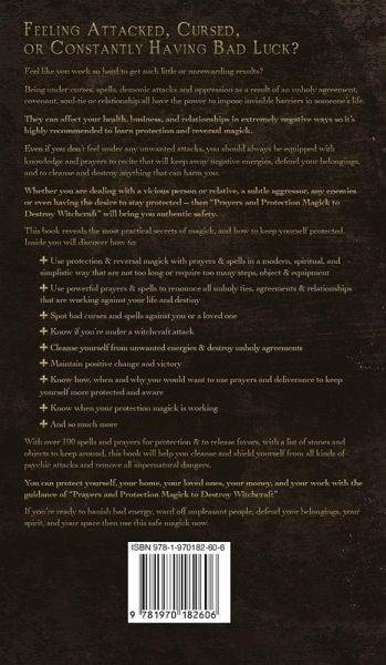 Feeling attacked, cursed, or constantly having bad luck? Feel like you work so hard to get such little or unrewarding results? Being under curses, spells, demonic attacks and oppression as a result of an unholy agreement, covenant, soul-tie or relationship all have the power to impose invisible barriers in someone's life. You can enter these unknowingly or knowingly... And they can affect your health, business, and relationships in extremely negative ways. For these reasons, it's highly recommended to learn protection and reversal magick. Even if you don't feel under any unwanted attacks, you should always be prepared and equipped with knowledge and prayers to recite that will keep away negative energies, defend your belongings, and to cleanse and destroy anything that can harm you. Whether you are dealing with a vicious person or relative, a subtle aggressor, any enemies or even having the desire to stay protected -- then "Prayers and Protection Magick to Destroy Witchcraft" will bring you authentic safety. This book reveals the most practical secrets of magick & how to keep yourself protected. Inside you'll discover how to: * Use protection and reversal magick with prayers and spells in a modern, spiritual, and very simplistic way that are not too long or require too many steps, objects, equipment etc; * Use powerful prayers and spells to renounce all unholy ties, agreements, relationships and covenants that are working against your life and destiny; * Spot AND stop evil curses, spells, and bad luck against you or a loved one; * Know if you're under a witchcraft attack; * Cleanse yourself from unwanted energies and destroy unholy agreements; * Release Favors AND maintain the positive change and victory; * Know how, when and why you would want to use prayers and deliverance to keep yourself more protected and aware; * Know when your protection magick is working; * And so much more With over 100 spells and prayers for protection and to release favors, having a list of stones and objects to keep around... this book will help you cleanse and shield yourself from all kinds of psychic attacks, remove all supernatural dangers and bring you victory. You can protect yourself, your home, your loved ones, your money, and your work with the guidance of "Prayers and Protection Magick to Destroy Witchcraft" If you're ready to banish bad energy, ward off unpleasant people, defend your belongings, your spirit, and your space then scroll up and click "ADD TO CART" now.
