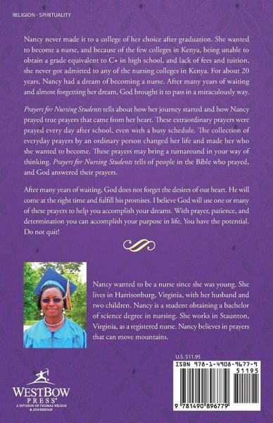 Nancy never made it to a college of her choice after graduation. She wanted to become a nurse, and because of the few colleges in Kenya, being unable to obtain a grade equivalent to C+ in high school, and lack of fees and tuition, she never got admitted to any of the nursing colleges in Kenya. For about 20 years, Nancy had a dream of becoming a nurse. After many years of waiting and almost forgetting her dream, God brought it to pass in a miraculously way. Prayers for Nursing Students tells about how her journey started and how Nancy prayed true prayers that came from her heart. These extraordinary prayers were prayed every day after school, even with a busy schedule. The collection of everyday prayers by an ordinary person changed her life and made her who she wanted to become. These prayers may bring a turnaround in your way of thinking. Prayers for Nursing Students tells of people in the Bible who prayed, and God answered their prayers. After many years of waiting, God does not forget the desires of our heart. He will come at the right time and fulfill his promises. I believe God will use one or many of these prayers to help you accomplish your dreams. With prayer, patience, and determination you can accomplish your purpose in life. You have the potential. Do not quit!