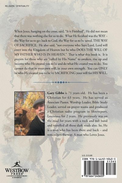 When Jesus, hanging on the cross, said, "It is Finished", He did not mean that there was nothing else for us to do. What He finished was the WAY - the Way for us to get back to God, the Way for us to be saved. THE WAY OF SACRIFICE. He also said, "not everyone who Says Lord, Lord will enter into the Kingdom of Heaven but he who DOES THE WILL OF MY FATHER WHO IS IN HEAVEN." That is what this book is. It is prayers for those who are "called by His Name" to awaken, rise up and become who He created you to be and do what He created you to do. You cannot do that in your own will, in your own strength. You can ONLY be who He created you to be by SACRIFICING your will for HIS WILL.