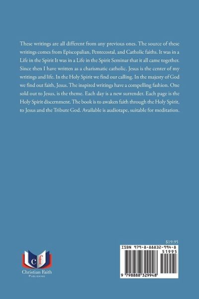 These writings are all different from any previous ones. The source of these writings comes from Episcopalian, Pentecostal, and Catholic faiths. It was in a Life in the Spirit It was in a Life in the Spirit Seminar that it all came together. Since then I have written as a charismatic catholic. Jesus is the center of my writings and life. In the Holy Spirit we find our calling. In the majesty of God we find out faith, Jesus. The inspired writings have a compelling fashion. One sold out to Jesus, is the theme. Each day is a new surrender. Each page is the Holy Spirit discernment. The book is to awaken faith through the Holy Spirit, to Jesus and the Tribute God. Available is audiotape, suitable for meditation.
